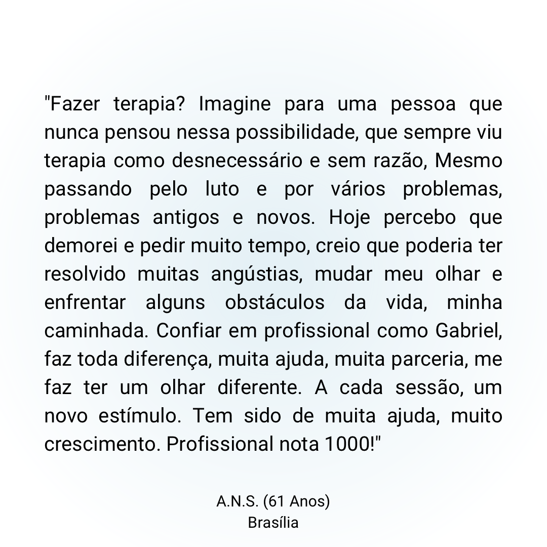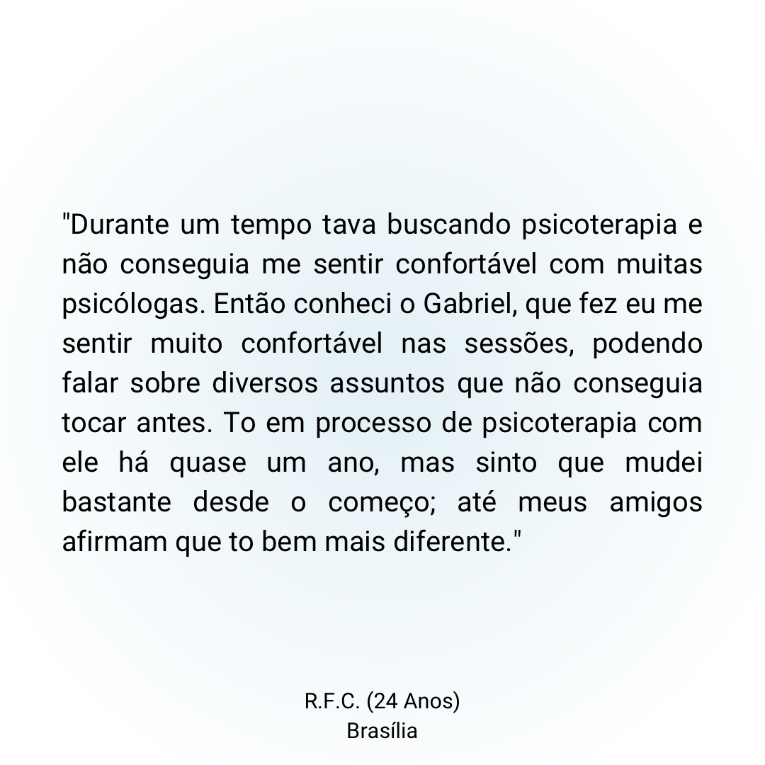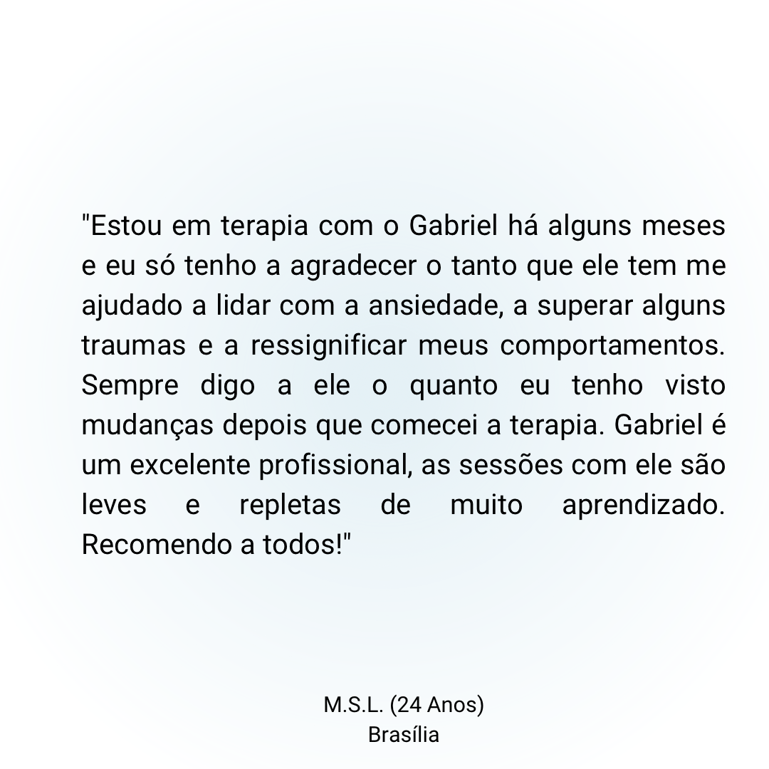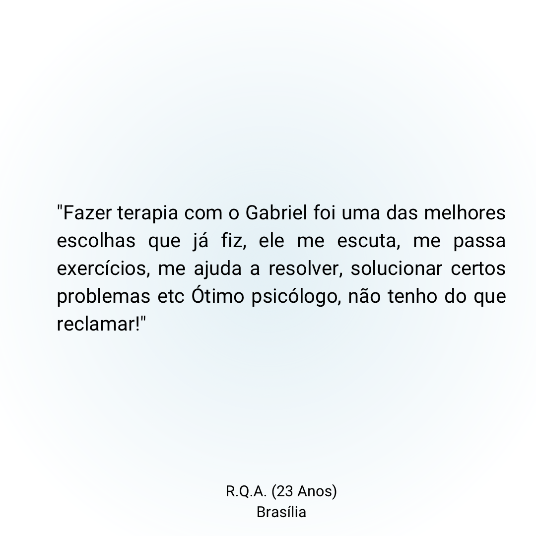 Sou Gabriel Nunes Martins (CRP-01/24968), psicólogo formado pelo IESB e com pós-graduação em Terapia Cognitivo Comportamental pelo IBNEURO. Com a minha experiência consolidada na clínica, ofereço atendimento psicológico online utilizando a Terapia Cognitivo-Comportamental (TCC), uma abordagem eficaz para lidar com uma variedade de desafios. Possuo vivência em interação psiquiátrica e em dar suporte a pacientes com dependência química e outras questões de saúde mental. Além disso, realizo avaliações psicológicas no contexto de trabalho e organizações, o que me confere uma visão ampla das dinâmicas que impactam o bem-estar.