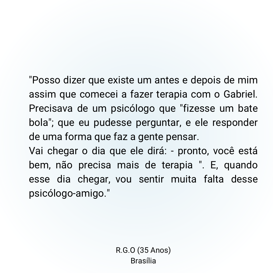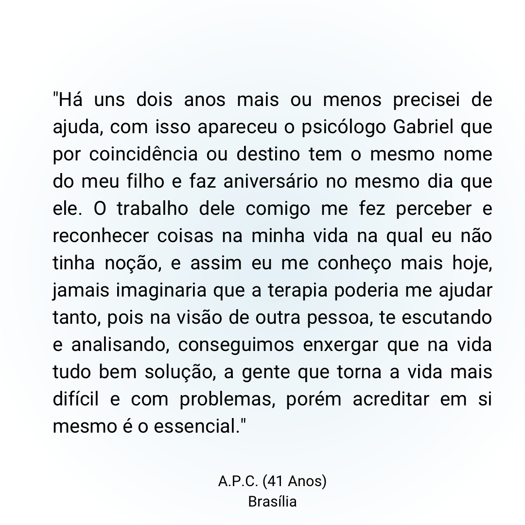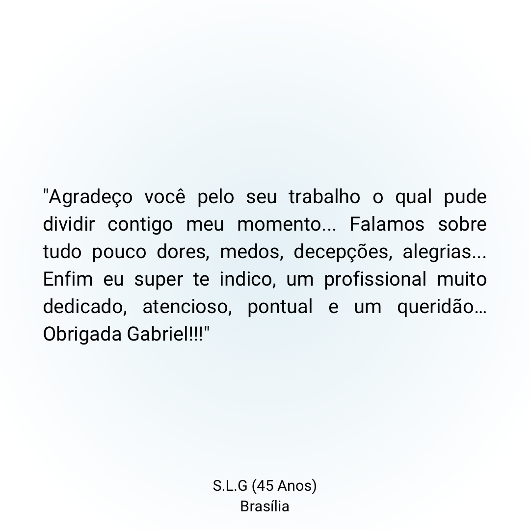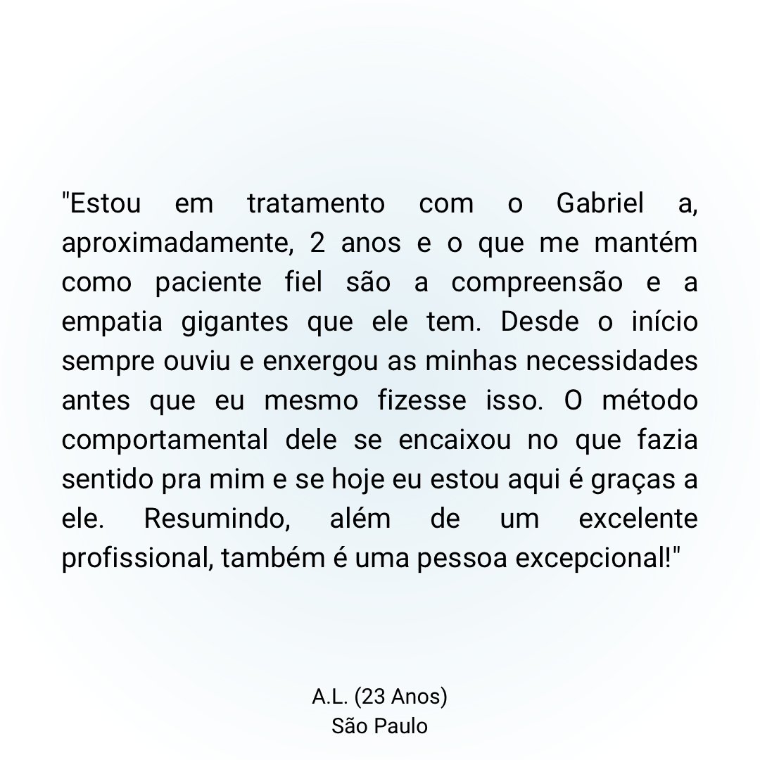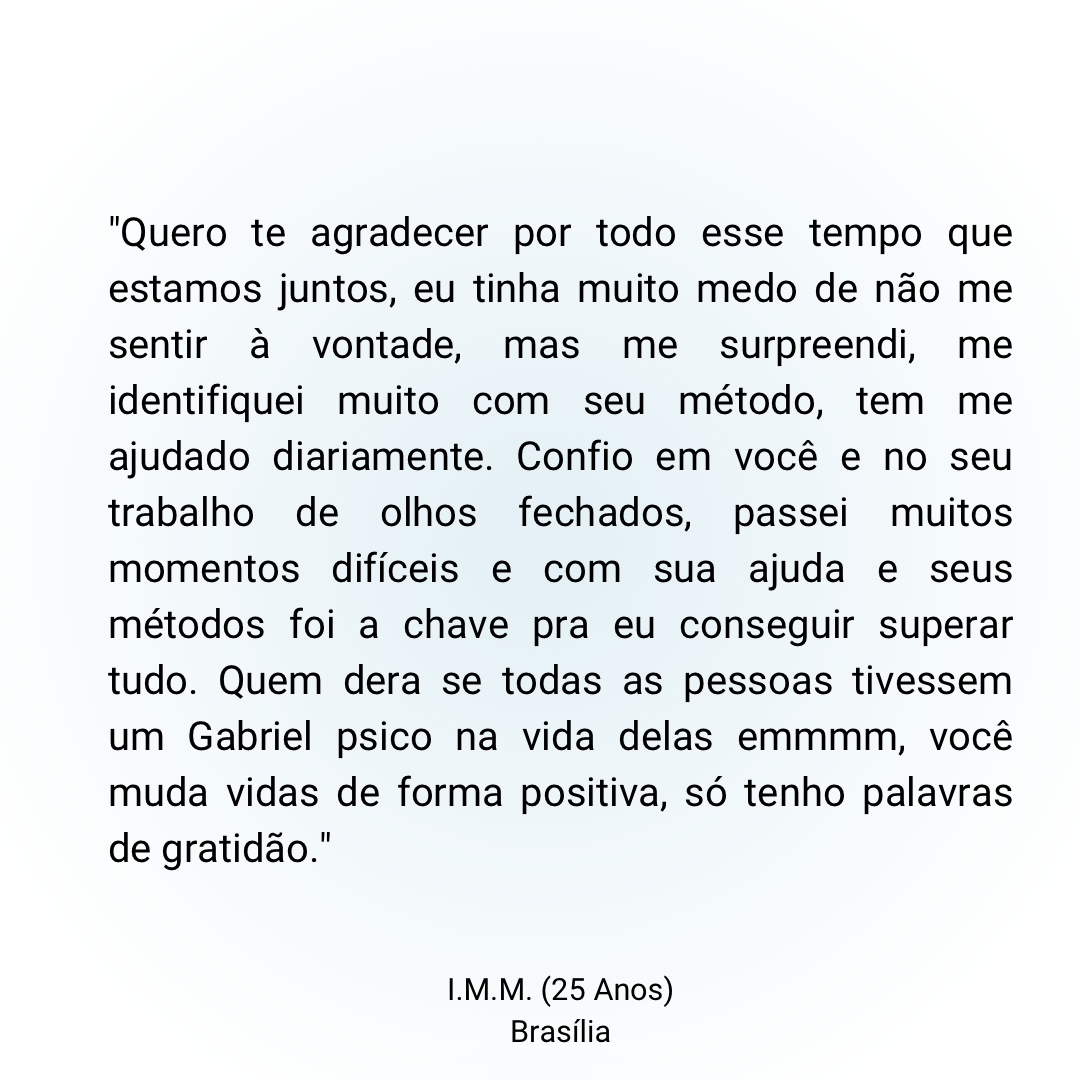 Sou Gabriel Nunes Martins (CRP-01/24968), psicólogo formado pelo IESB e com pós-graduação em Terapia Cognitivo Comportamental pelo IBNEURO. Com a minha experiência consolidada na clínica, ofereço atendimento psicológico online utilizando a Terapia Cognitivo-Comportamental (TCC), uma abordagem eficaz para lidar com uma variedade de desafios. Possuo vivência em interação psiquiátrica e em dar suporte a pacientes com dependência química e outras questões de saúde mental. Além disso, realizo avaliações psicológicas no contexto de trabalho e organizações, o que me confere uma visão ampla das dinâmicas que impactam o bem-estar.